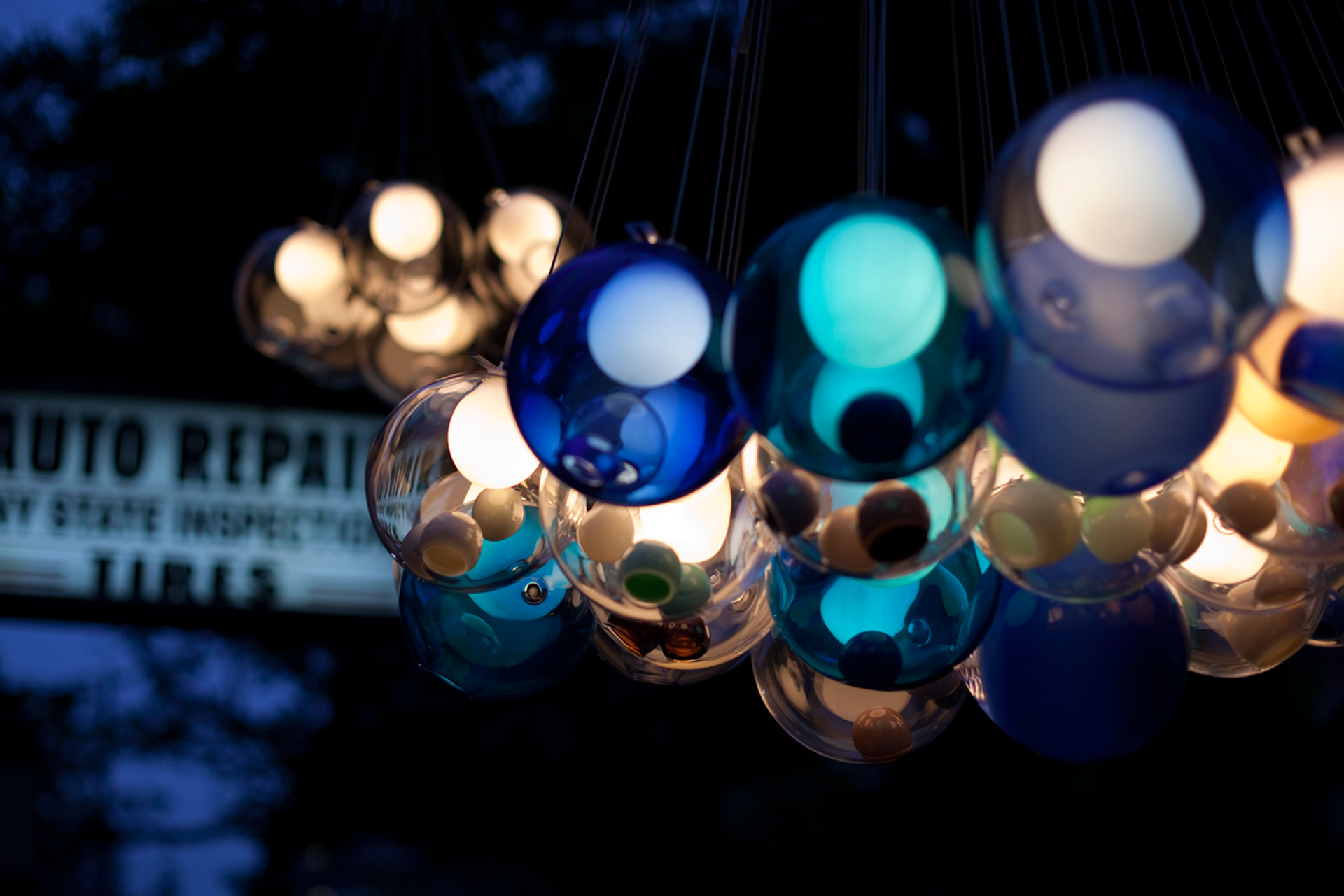 28.19 is a cluster of nineteen 28 pendants hung from a round canopy. The pendants hang in shape of a hexagonal bouquet, bundled together by an adjustable ring, which changes the curvature of the piece and its proportional reading. 28 is an exploration of specificity in manufacturing. Instead of designing form itself, here the intent was to design a system of making that yields form. Individual 28 pendants result from a complex glass blowing technique whereby air pressure is intermittently introduced into and then removed from a glass matrix which is intermittently heated and then rapidly cooled. The result is a distorted spherical shape with a composed collection of imploded inner shapes, one of which acts as a shade for a low voltage light source. 28 pendants are designed to cluster in hexagonal shapes which nestle into each other to create patterns as dictated by the needs of the interior. They may also be clustered or composed in an ambient manner similar to their distant cousins the 14’s. Standard 28’s are made with clear glass exterior spheres and milk white interior lamp holder cavities. 28’s are possible with infinite versatility in color compositions, sizes and shapes.