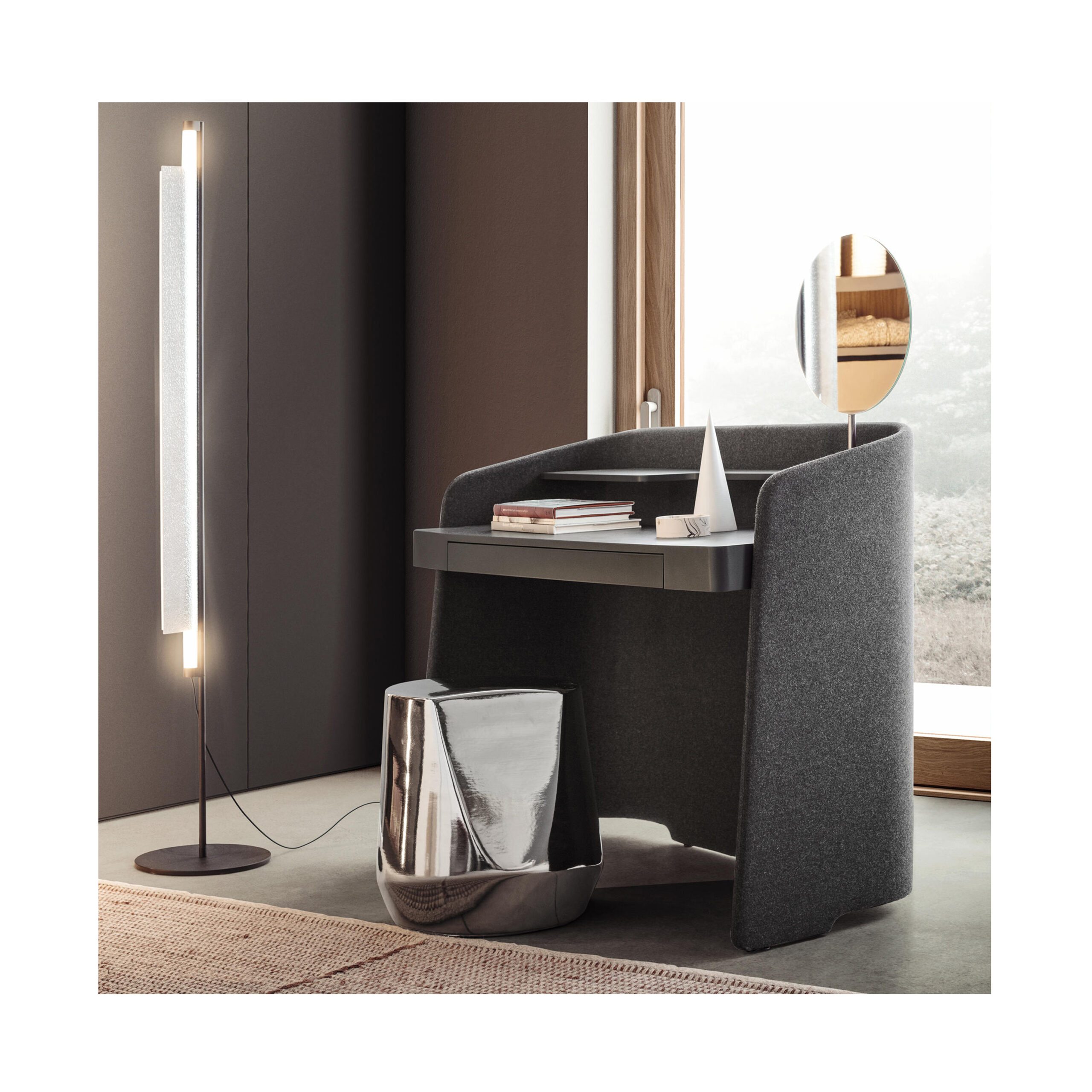 Supersuede 63 fabric structure and Seta matt lacquered desk and shelf; Silver mirror with Titanio metal frame and structure.