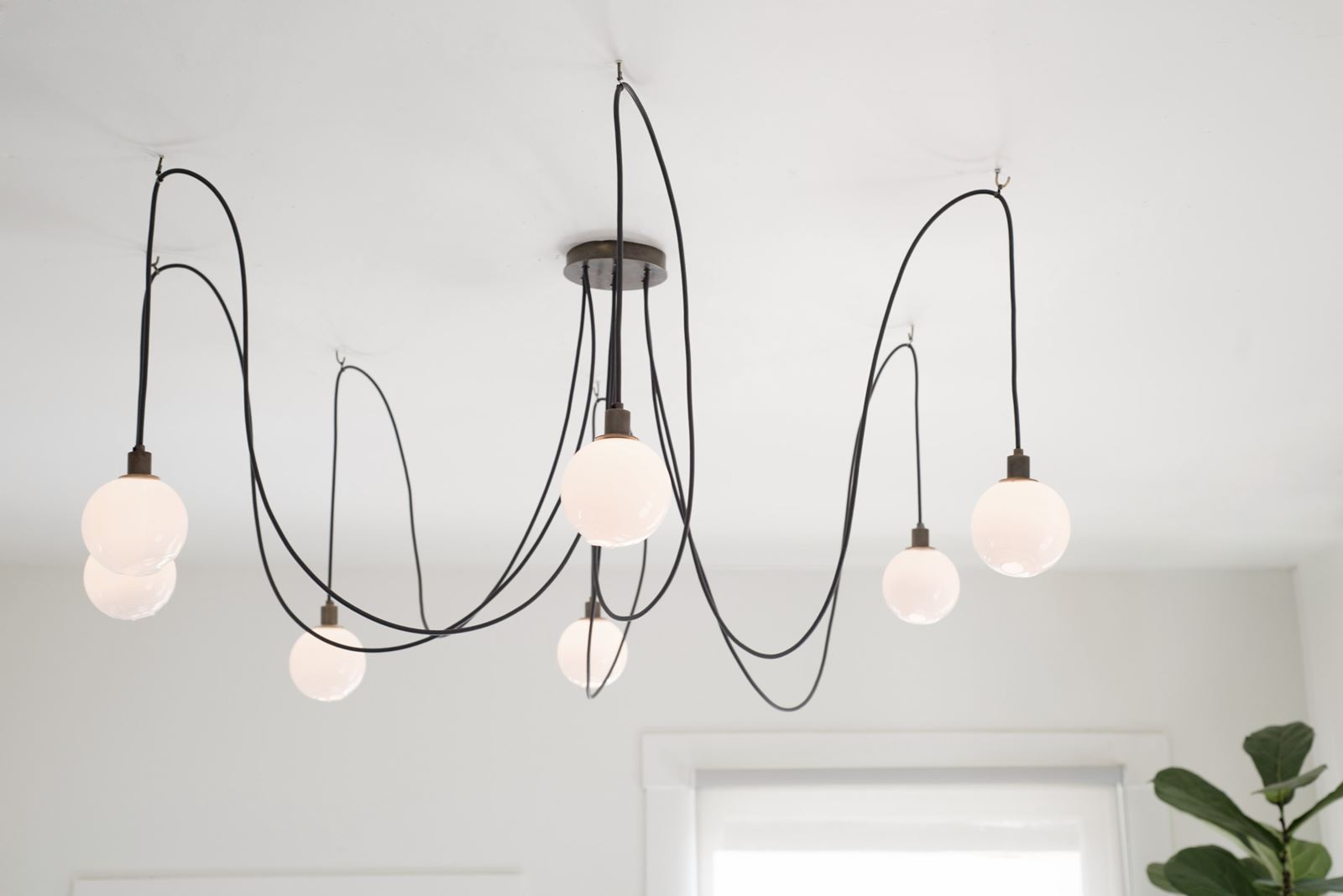The drape hook pendants are a series of organic multi-light light fixtures that allow for infinite composition and variation. Available in nine, seven, five, three, and one-light versions, drape hook offers a unique ability to integrate into architecture and interiors. drape hook 1 consists of a single 4 1/2″ (11cm) diameter hand-blown glass pendant suspended from a single canopy on fabric wrapped cord. The glass spheres are hand blown Czech glass, each with a double-dipped fire-polished mouth where the piece is broken from the glass master’s pipe, making each unique. Comes with a custom solid brass loop attached to the cord, allowing for the pendant to be hung from the solid brass ceiling hook (included).
