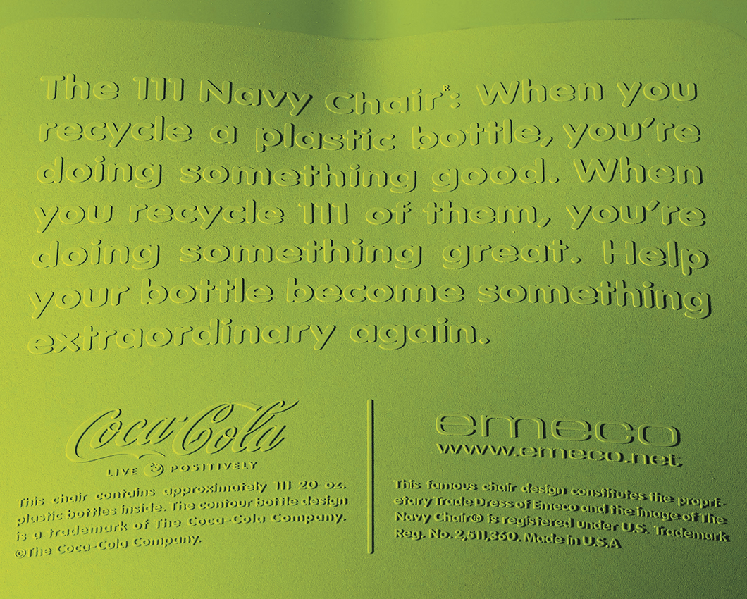 Coca-Cola and Emeco collaborated to solve an environmental problem: Up-cycling consumer waste into a sustainable, timeless, classic chair. Made of 111 recycled PET bottles, the 111 Navy Chair is a story of innovation.