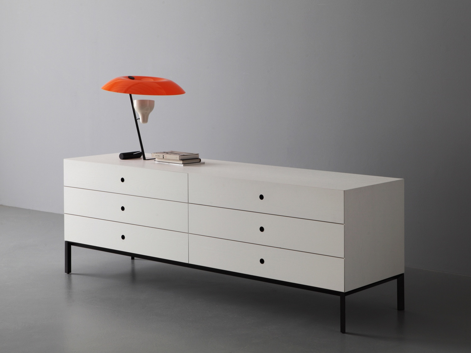 The Offshore series of containers by Piero Lissoni consists of six different types that include cupboards and chests of drawers in height 140 or 70 to be used in the dining area, living room or bedroom. The sideboards are made of ash wood with a special and accurate construction at 45 ° degrees which, thanks to the continuity of the wood grain on all sides, creates a continuous volume. The interiors are made of natural maple, matching the exterior in open-pore stained ash in the colors of the collection or the Carminio finish obtained through repeated manual steps, thanks to which the grain, previously darkened with black tones, comes to the surface in fascinating colors.