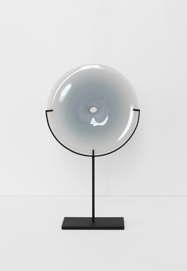 SkLO pool objects are discs of handblown glass with open mouths at the center where the pieces are broken from the glassmaster’s pipe and flame polished, giving each a unique detail. With handmade steel table stands.All sizes available with steel table stands. Medium, small, and mini sizes also available with brass table stands.